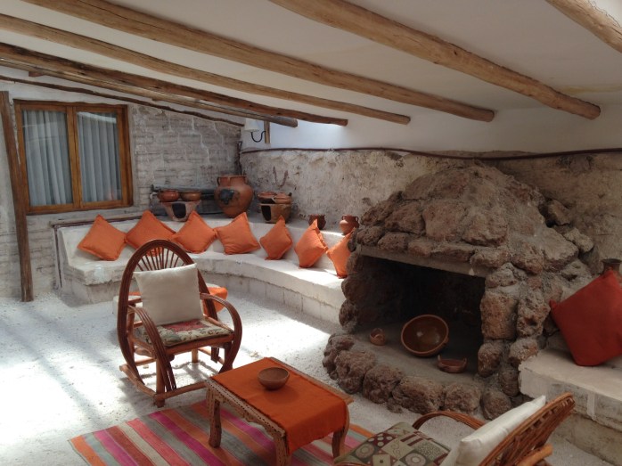 Finally close to 6 AM we spotted in the still darkness some houses on a low hill. A few lights were on and more came on when I walked up the steps towards the main door. Me and the taxi driver managed to get someone to respond to the speaker phone, who directed us to a side door that was unlocked. It took a while until a staff member appeared. While I was waiting I had time to look around. Impressive, tasteful and stylistic interior design caught my eyes. Originality in the usage of salt cubes was evident not only in the walls and floor, but also in the furniture. Unlike many places in Bolivia, I encountered a smiling person, good humored and speaking good English. Could it really be that the fact that we were now in Quechua-speaking area contributed to this change? Whatever the answer was, I was glad that communication was now smooth and effortless.