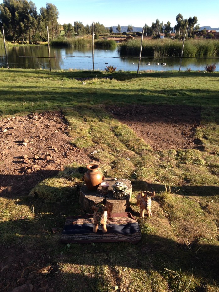 We stood on a circular platform open in all directions, next to a beautiful pond. On the platform were two effigies of baby llamas and a clay bowl. After the shaman had blessed the above mentioned forces, every participant did the same by blowing coca leaves out of one’s hand.