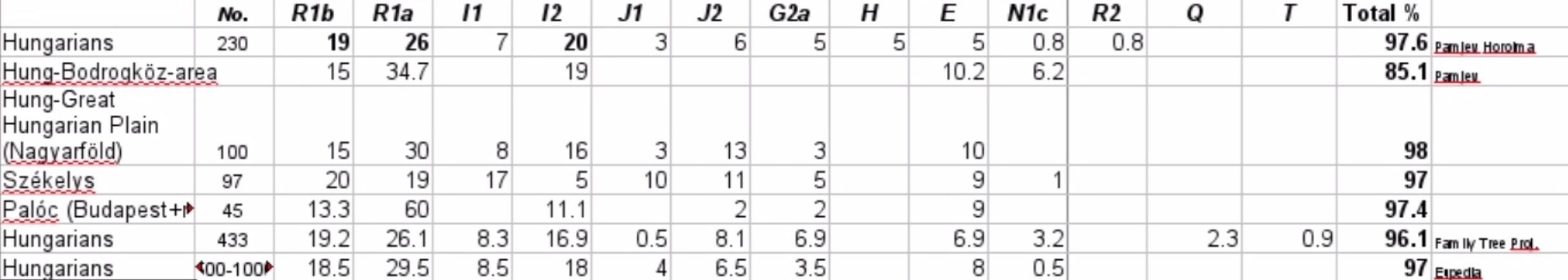 Conclusion: Hungarians are a mixed group of people, generally speaking. East and north of Donau River people are mostly related to Slavic-speakers of haplogroup R1a. West of Donau R. haplogroup R1b dominates of the Germanic/Celtic heritage. South is haplogroup I2 of the ancient Donau River Valley populations that have inhabited the fertile fields in central and lower Donau since before Celtic, Germanic and Slavic peoples arrived in this area. Interspersed among Hungarians, but more frequently west of Donau R., are low frequencies of haplogroups that originated in the eastern part of the Mediterranian and in Anatolia. These groups most likely arrived during Roman times as it was a military tradition to reward veteran soldiers from the legions with a piece of land somewhere on the border regions in the Empire. It was a smart move as these veterans were among the most loyal subjects that would defend both their land-holdings and the Empire more diligently than ordinary subjects in the Roman provinces.