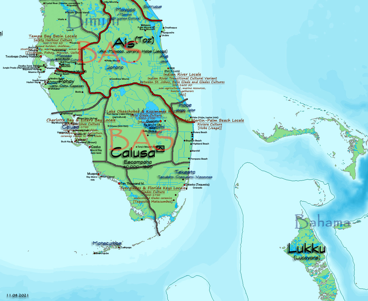 The Calusa were once the dominant power in southern Florida. Numbering about 40.000 around 1500 AD, they dominated neigbouring tribes. Their society was stratified with a ruler having almost royal powers, or at least it seemed that way to the Spanish who were the first Europeans to make contact with them. Speaking a language possibly related to Tunican in the lower Mississippi Valley, they formed a paramount chiefdom based not on agriculture but on the rich marine resources of their land.