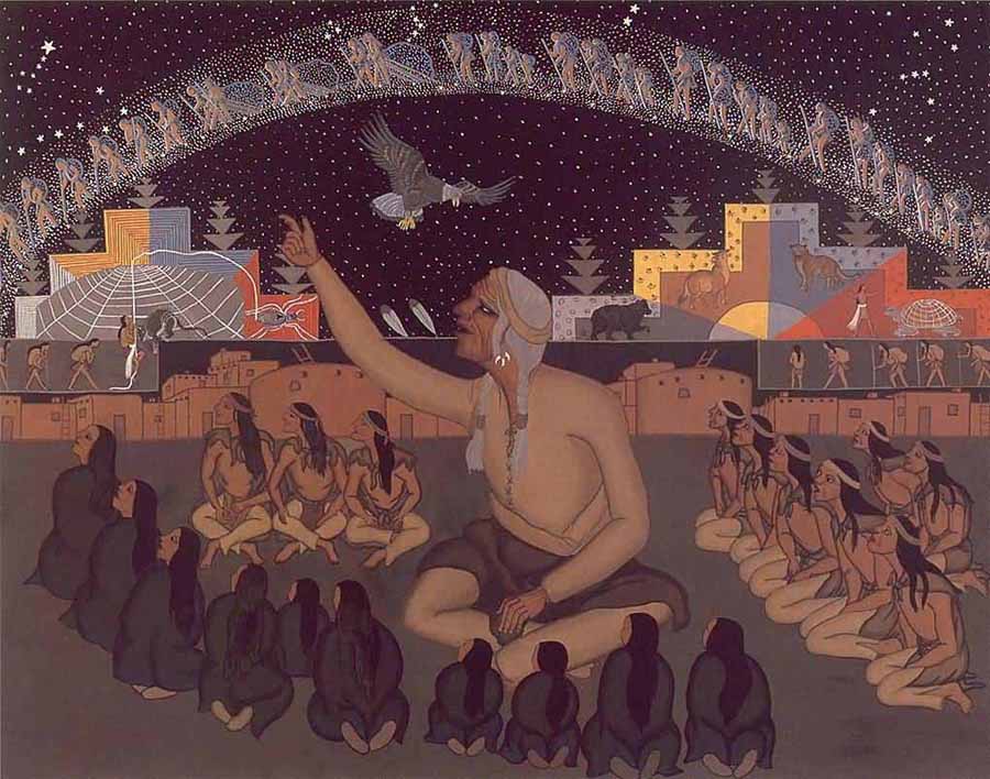Into this group came later Keresan-speaking clans from the Kayenta (Tusayan) Anasazi, along with San Juan and Mesa Verde Anasazis that seem to have been Keresan-speaking as well. Not all members of these clans migrated. Some stayed and formed their own clan, keeping their old name and function within a new cultural group, adopting a language of a migrating and populous group of a hunting and gathering Athabascan-speaking people from the north, later known as the Diné or Navaho.